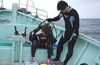 ウエイト・器材の準備はいいですか?八丈島のボートダイビングは漁船を利用します。オリーブ専属の船(岩丸)です。船にトイレがないのでトイレを済ませておきましょう。